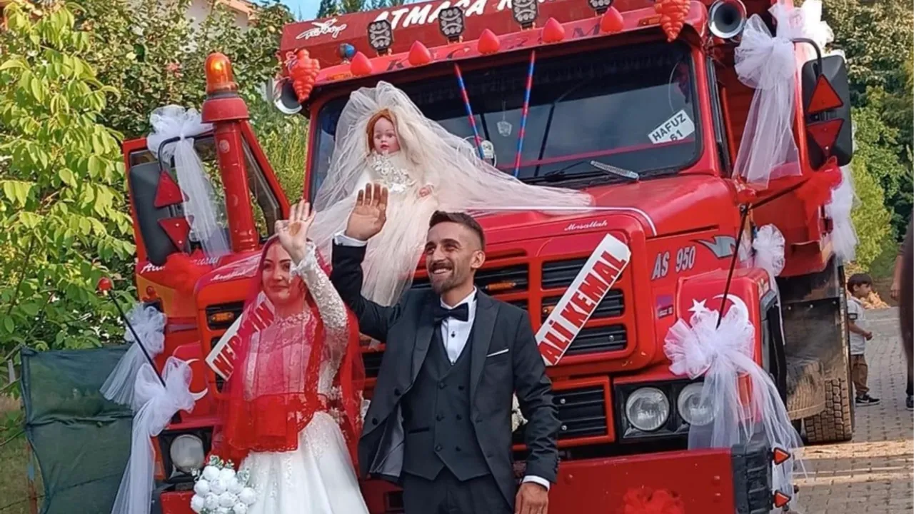 Düzce’de 26 yaşındaki hafriyat kamyonu sürücüsü Yusuf Kazancı, kamyonunu “Evleniyoruz, mutluyuz” yazısıyla süsleyerek gelin arabasına çevirdi. 23 yaşındaki Nermin ile evlenen Kazancı’nın şehir turu sosyal medyada büyük ilgi gördü.Sefer DEMİR / DÜZCE (İGFA) - Düzce’nin Karaçalı Mahallesi’nde yaşayan 26 yaşındaki hafriyat kamyonu sürücüsü Yusuf Kazancı, eşi 23 yaşındaki Nermin Kazancı ile gerçekleştirdiği düğünde sıradışı bir gelin arabası tercih etti.