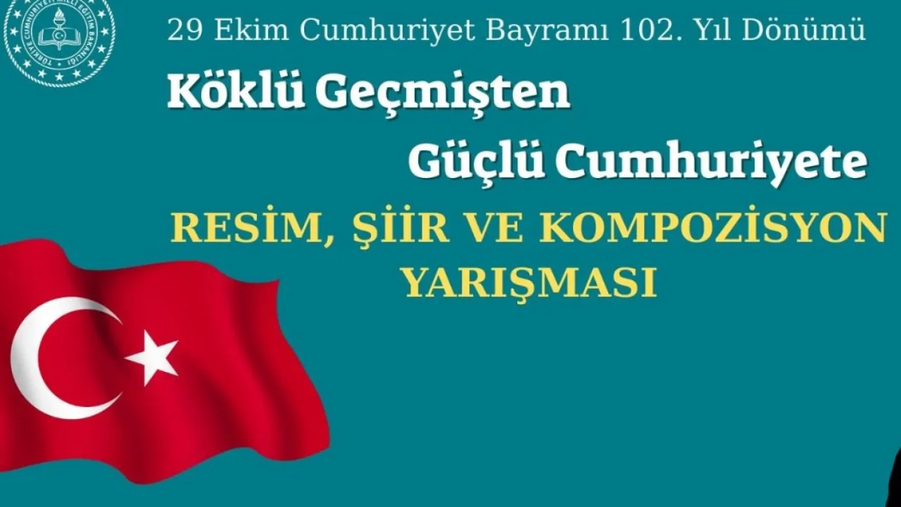 Milli Eğitim Bakanlığı, Türkiye Cumhuriyeti'nin 102. yıl dönümü kutlamaları kapsamında, ilk ve ortaokul öğrencileri arasında "Köklü Geçmişten Güçlü Cumhuriyete" konulu resim, şiir ve kompozisyon yarışması düzenleneceğini duyurdu.ANKARA (İGFA) - Milli Eğitim Bakanlığı Temel Eğitim Genel Müdürlüğü tarafından yürütülecek yarışma, ilkokullarda resim; resmî ortaokullar ve imam hatip ortaokullarında ise resim, şiir ve kompozisyon dallarında gerçekleştirilecek.